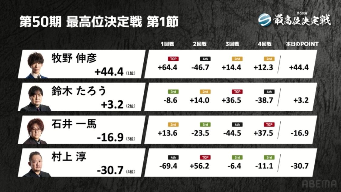 決定戦初日終了。牧野さんが本日の勝ち頭になりました。自分の予想は牧野→村上→一馬→たろうと予想してましたが、1位のみ的中しました😋